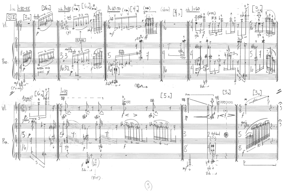 ![]() "the children of fire come looking for fire" (2012) [Duos with Piano III] instrumentation: amplified violin, prepared piano duration: 25' date: 2012 The spur for this piece, as well as its source material and guiding metaphor, comes from a cadence in the coda of an early Brahms piano piece (Op. 10, Nr. 4)-- a bizarrely symmetrical, contrary motion "wedge" shape that contracts from a perfect fifth to a perfect fourth and inwards to unison. In the context of this piece, the idea of the wedge (i.e. ">") is converted to a neume that functions on every structural level of the piece, from global trajectories to micro-gestures and even physical motions for the performers. Additionally, the metaphorical implications of this shape (contraction, filtering, focusing in from a wide field to a single point; to stretch it further-- tuning; further still--- renunciation) structure the unfolding of the material over the course of the form. The material from Brahms is heard fleetingly at the end, rasterized to just intonation. The piece was written for, and is dedicated to, Josh Modney, with whom the violin material was developed over the course of several months of meetings, working sessions, and rehearsals. The piece couldn't have been written without his patient, open, and committed involvement in the process. |