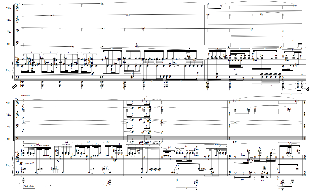 ![]() "... more than once he gave serious thought to deserting, living like a tramp in Normandy, finding a cave, feeding himself on the charitable offerings of peasants or small thefts that no one would report. I would learn to see in the dark, he thought. In time my clothes would fall to rags and finally I would live naked. I would never return to Germany. One day I would drown, radiant with joy." - Roberto BolaƱo, 2666 commissioned by the Left Coast Chamber Ensemble instrumentation: violin, viola, cello, double bass, piano duration: 16' date: 2008-9 score sample |
